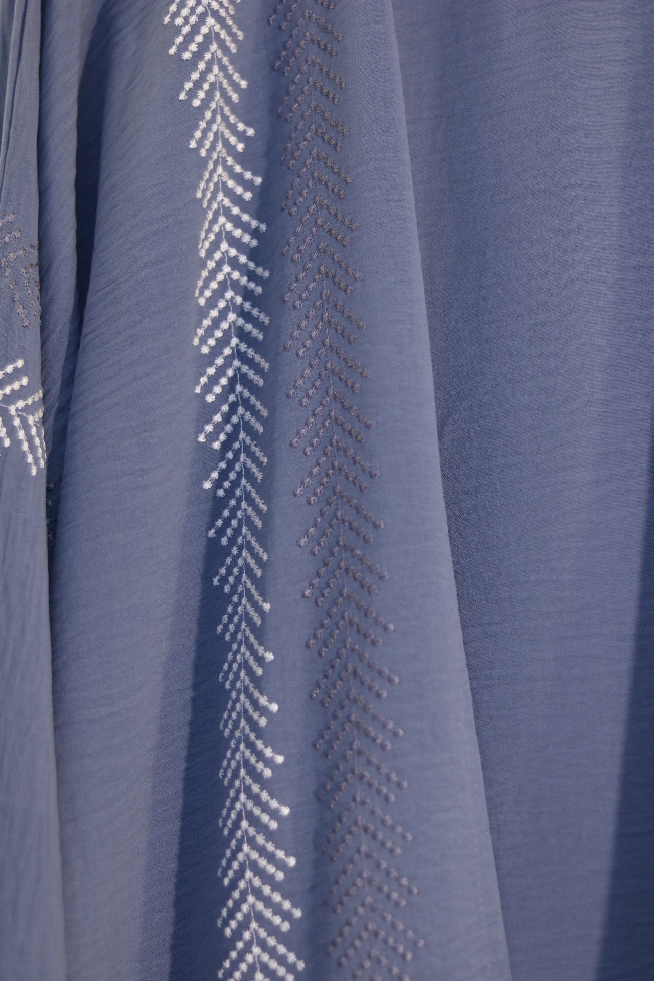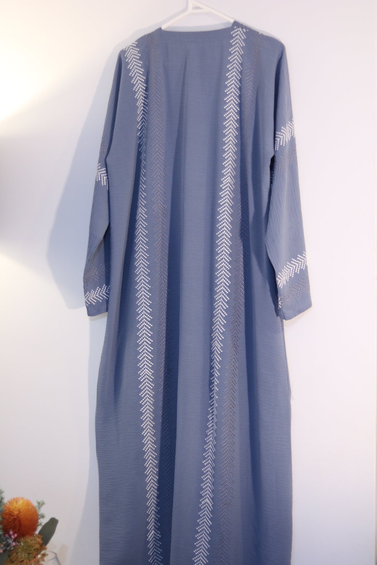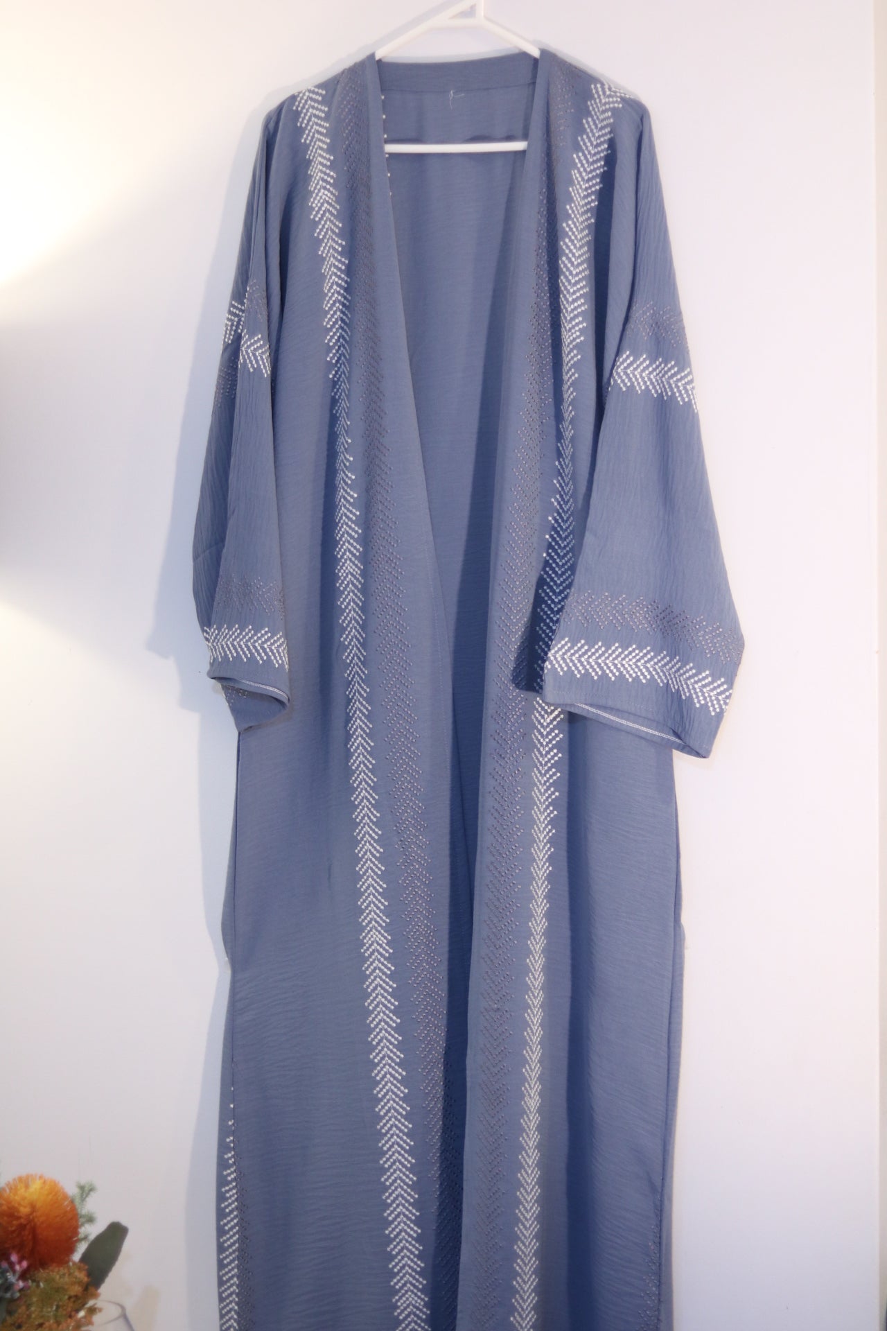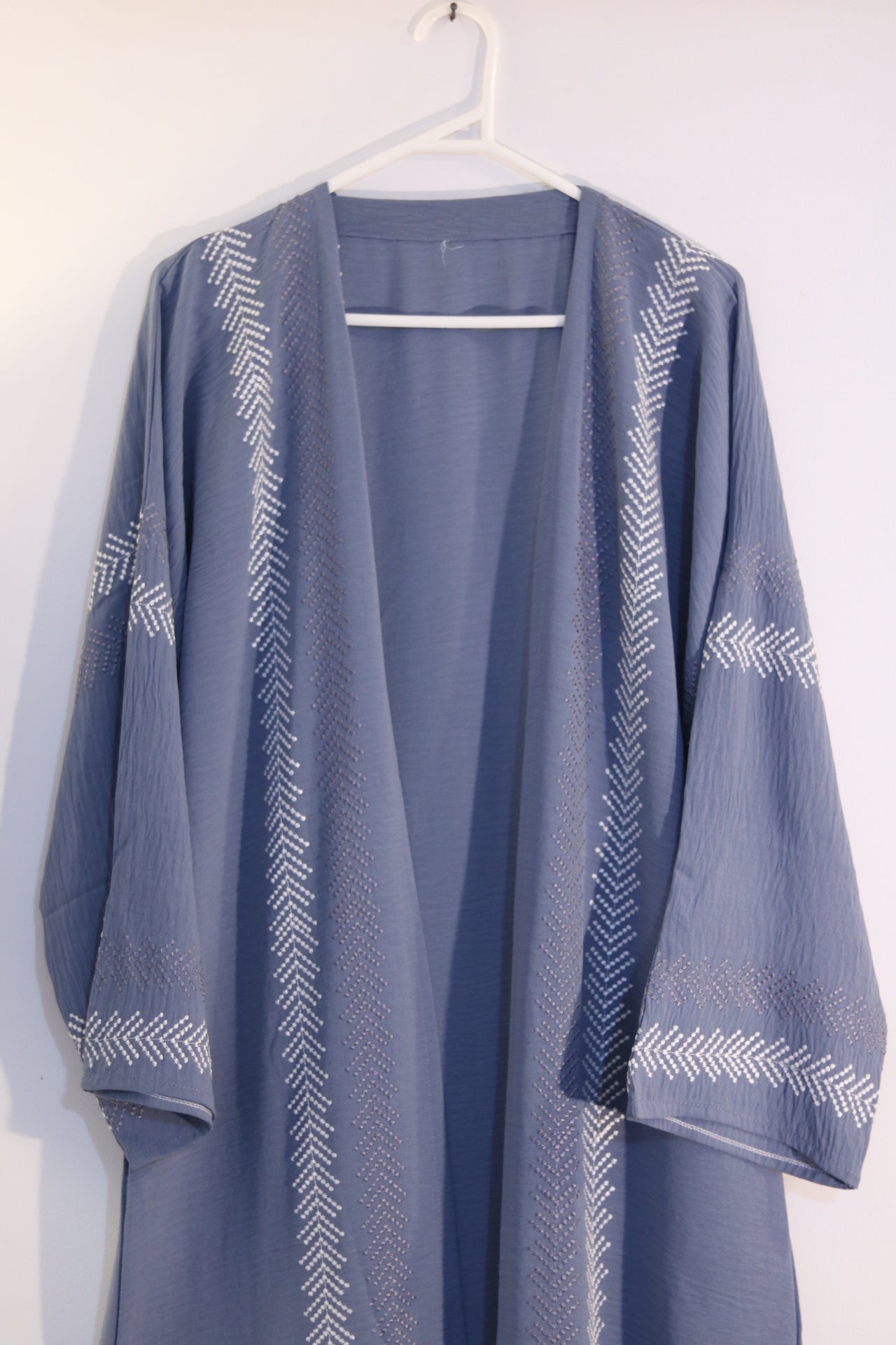 Add a classy touch to your wardrobe with this soft blue abaya. The outer dress features elegant vertical lines of alternating grey and white symmetrical embroidery, creating a graceful and modern look. Designed for comfort and style, this set includes a matching white inner dress and hijab, offering a cohesive and polished appearance. Perfect for those seeking a blend of subtle detail and timeless style, this abaya is ideal for both everyday wear and special occasions.